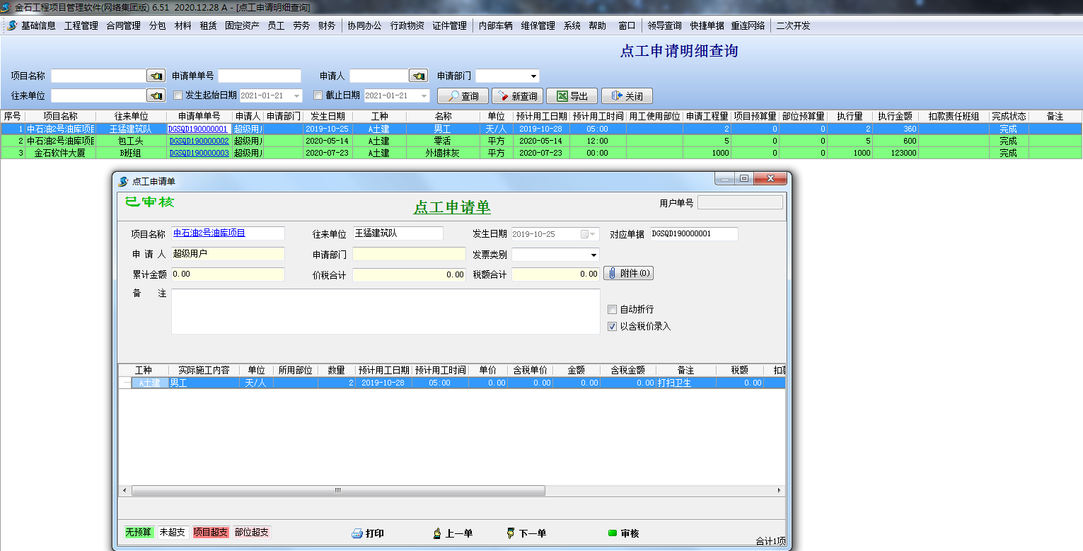 點工是勞務(wù)分包常見勞務(wù)派工形式,通過該單據(jù)可以清晰查閱每個項目涉及到的點工使用明細,包括:預(yù)計用工時間、用工部位、申請工程量、部位預(yù)算量、執(zhí)行金額、完成狀態(tài)。
