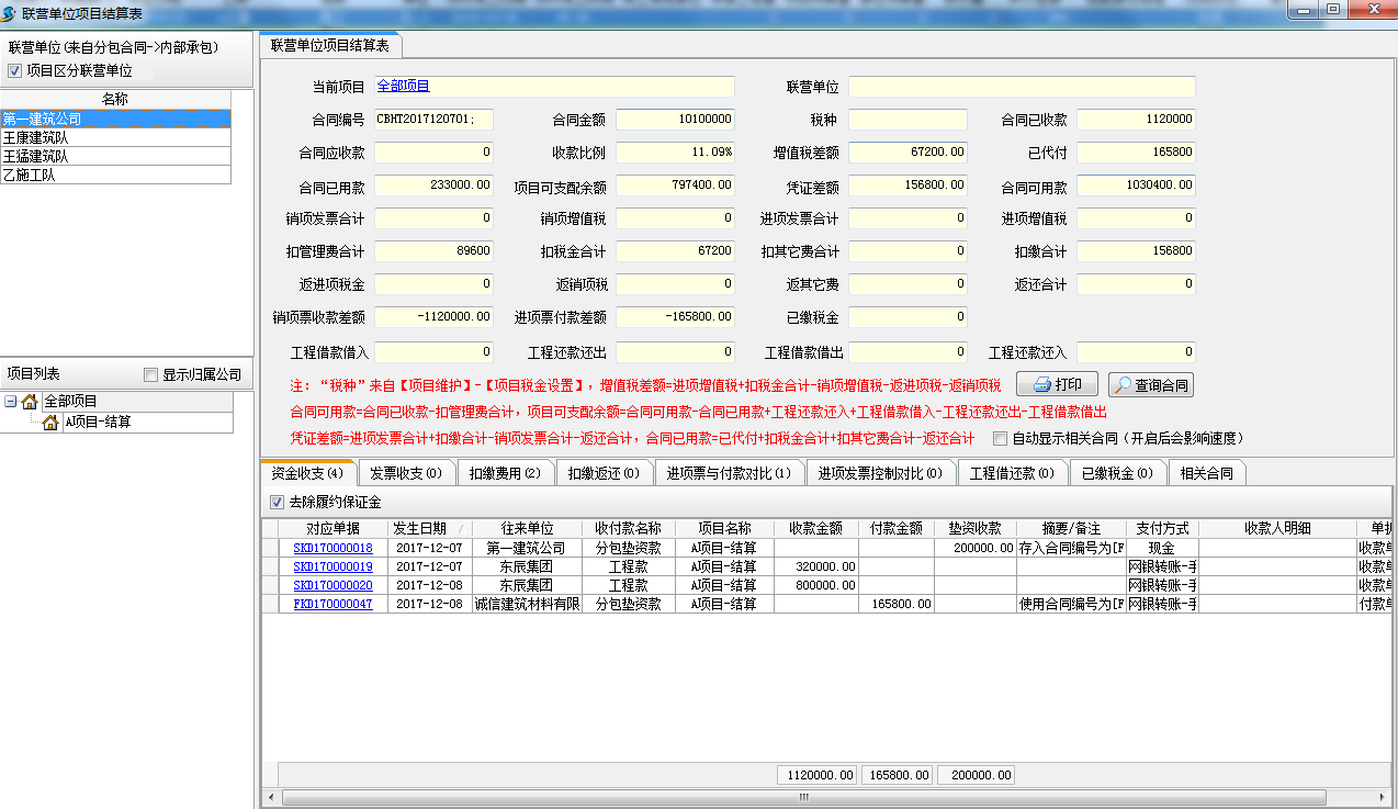 聯(lián)營單位結(jié)算明細主要反饋聯(lián)營企業(yè)相關(guān)結(jié)算數(shù)據(jù),包括:合同當前已用款項、可支配余額、已代付信息、資金收支、發(fā)票收支、扣繳返還、工程借還款、已繳納稅金等情況。