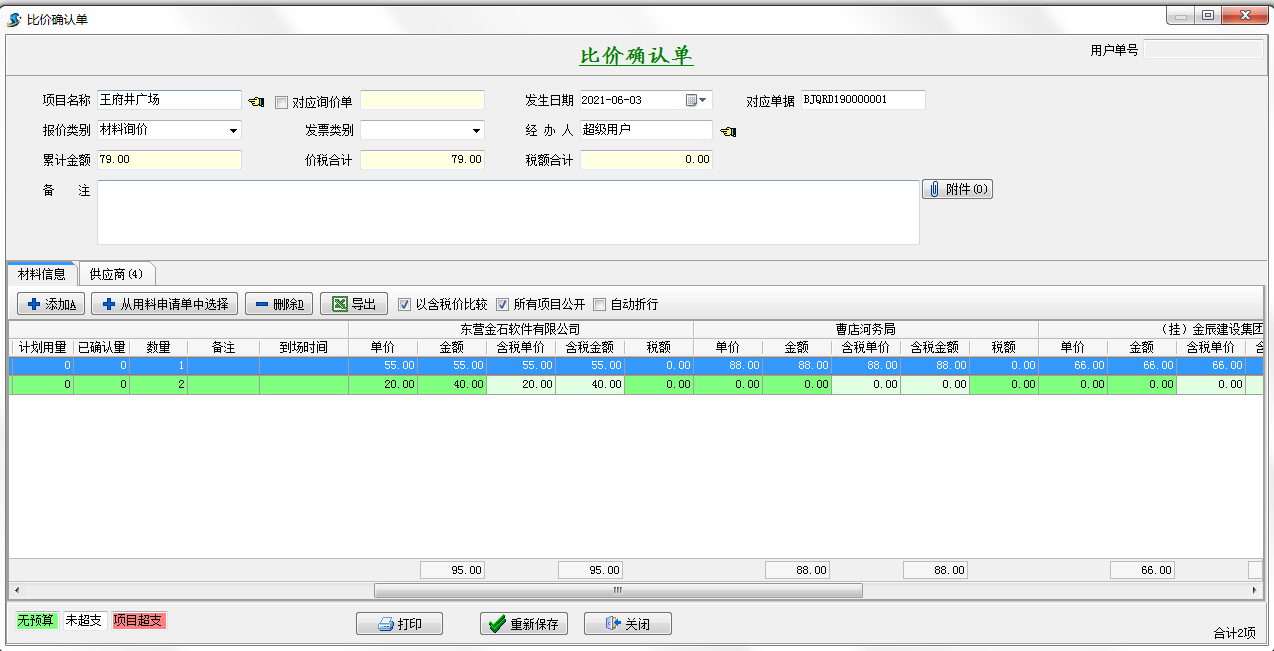 所有數據完成后,下方即出現各個供應商的報價信息,系統會根據發起項目的預算自動監控報價信息的情況。
