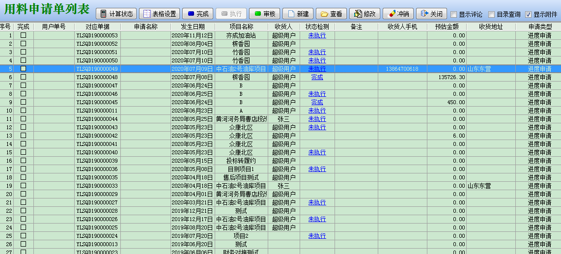 項目一線部門提交用料申請單后,需經領導審核后才能執行,當用料申請單保存后,二次點擊將出現審核按鈕,完成審核后,單據右上角將會標注綠色的已審核按鈕。當然,用戶也可以在列表界面批量選中單據,點擊列表界面的審核按鈕,即可實現批量審核。