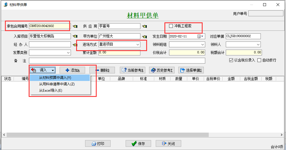 注:大部分【材料甲供單】都是有合同依據的,即選擇承包合同編號,如果不選擇合同編號可能會影響到合同待收付款的計算(當前發生項目對應的承包合同中規定的【甲供材扣除工程款】項打鉤)。