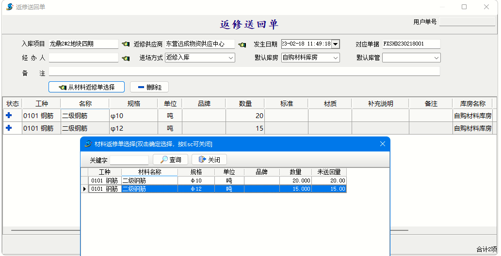 2、返修送回單【返修送回單】用于登記供應商維修完成送回的材料明細記錄,保存后可以在單據列表查看單據信息