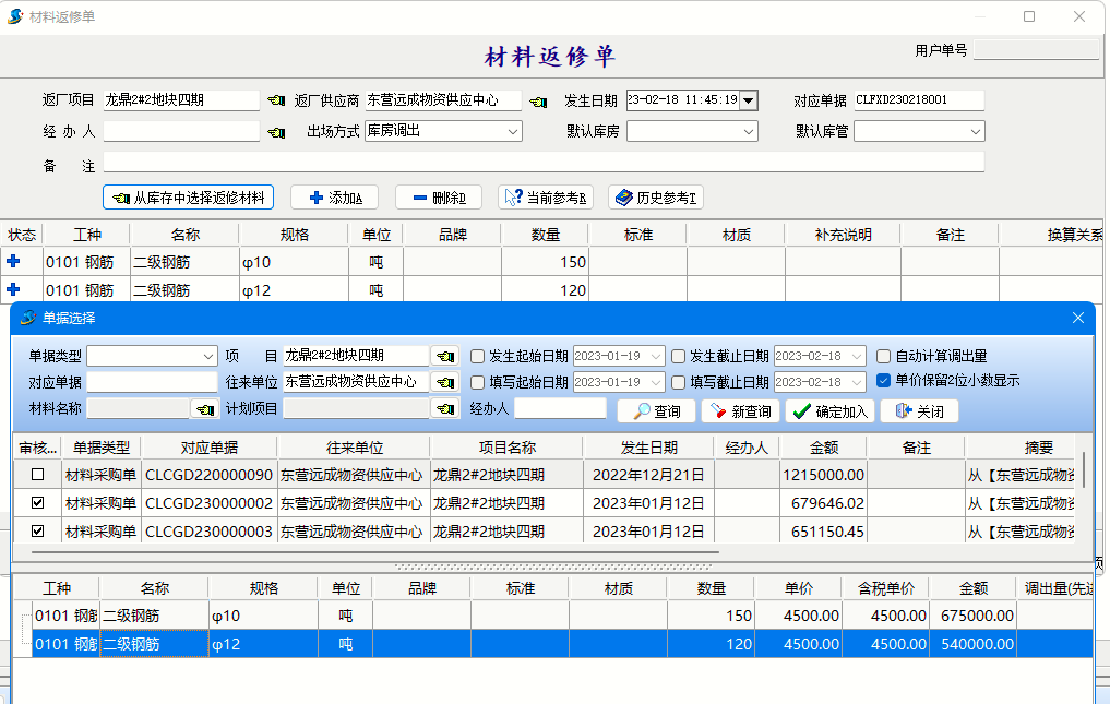 材料返修用于管理材料購買后返回供應商維修登記。