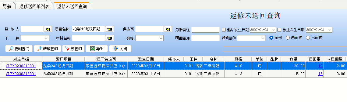 3、返修未送回查詢返修未送回查詢用于查詢送回供應商維修供應商還未送回的材料明細。