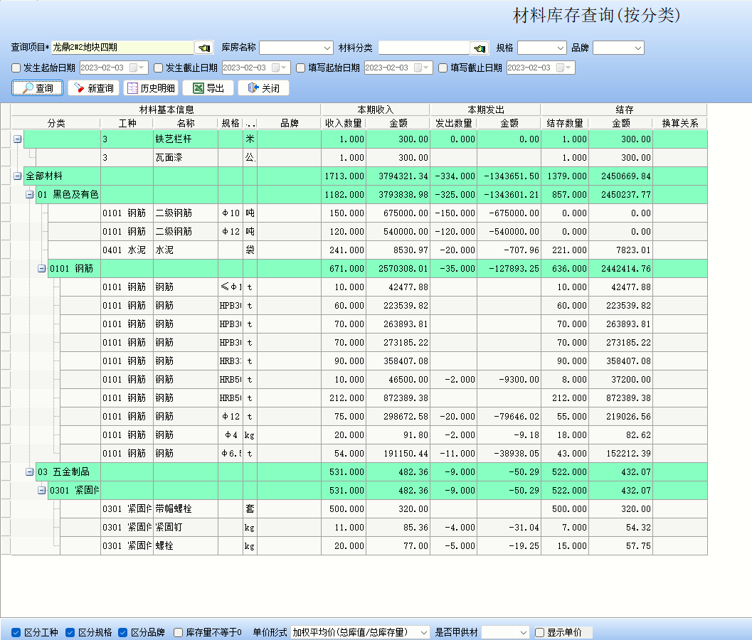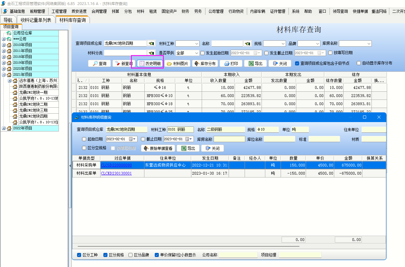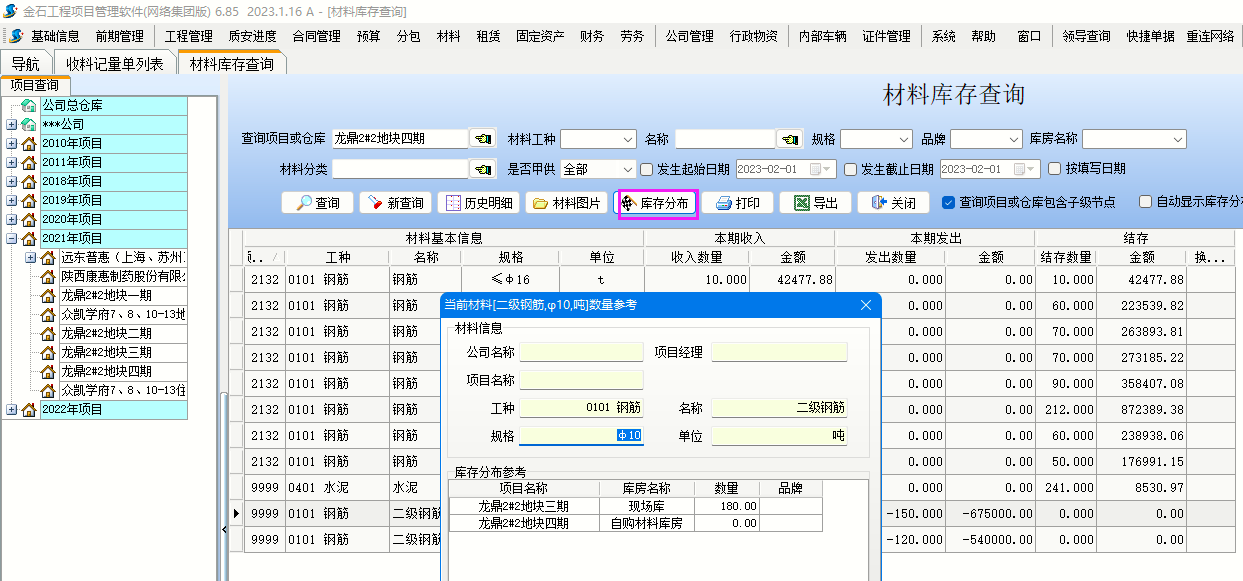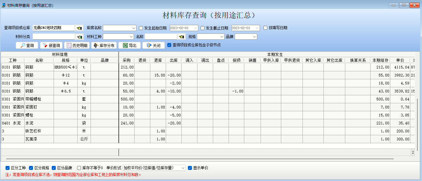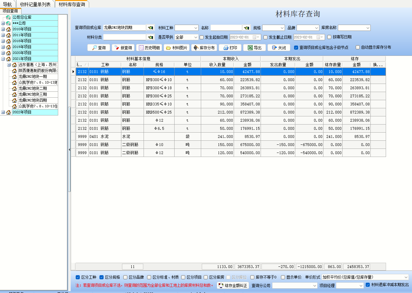【材料庫存查詢】查詢某項目或某倉庫上的材料庫存(即庫房中的存量)。