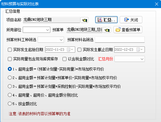 對比是按照預算單材料名稱為基準的。可以按照部位、工種、材料名稱篩選,還可以選擇實際發生起始時間,實際用量是否保存庫存、已含稅金額對比,按照月份匯總。