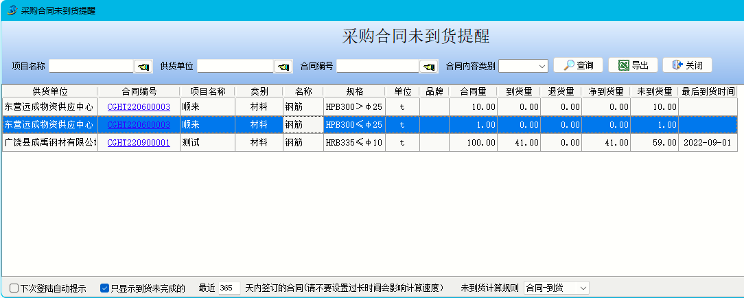 采購合同未到貨提醒是用來顯示合同超期未到貨明細。可以設置多少天內簽訂的合同和設置登錄是否自動顯示。
