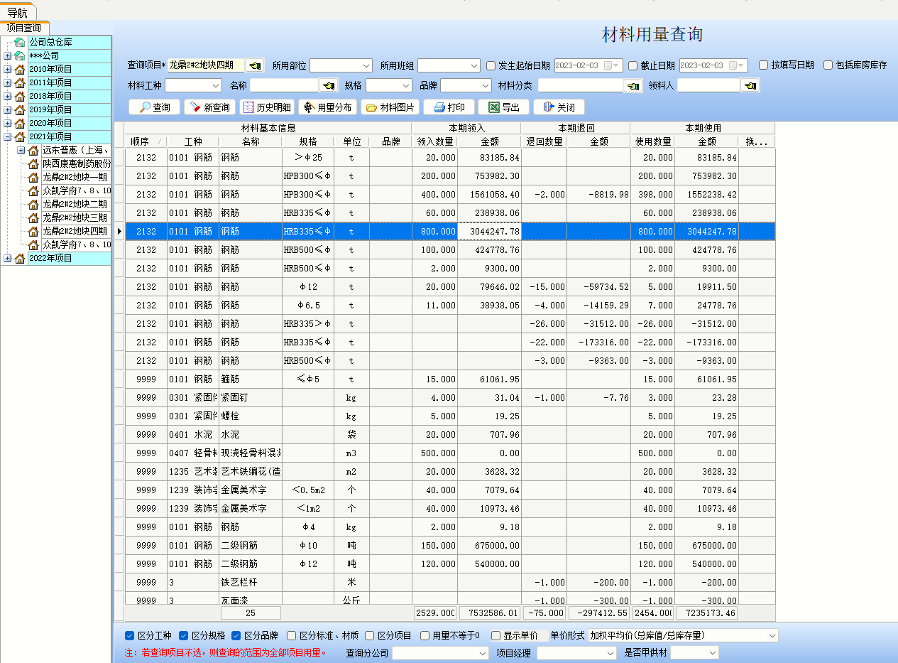 【材料用量查詢】是用于查詢工地材料用量。可以按照項目、部位、材料名稱、時間等篩選材料用量信息。