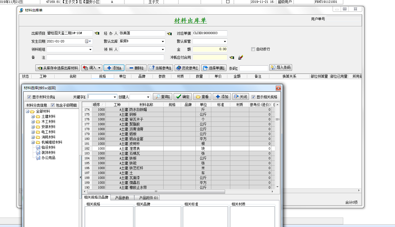 材料出庫主要通過材料出庫單進行管理,在此模塊中,可以從庫存中調取材料,也可以從材料信息庫中設置出庫材料信息,需要填報清晰的材料相關數據,并會自動關聯材料庫存,如有出入庫超預算將會予以標記。并可以在線選擇是否沖抵合同款。