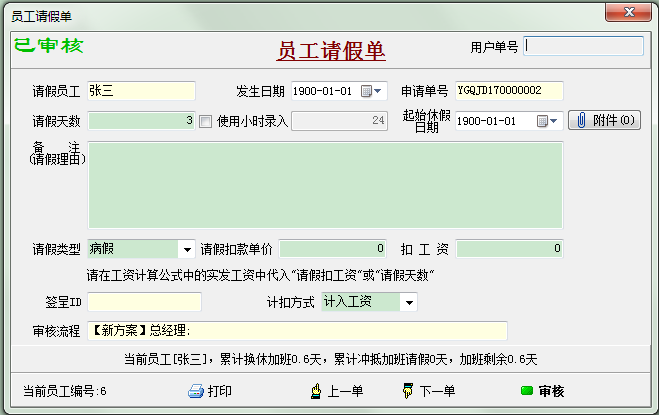 員工請(qǐng)假需發(fā)起員工請(qǐng)假單,詳細(xì)填報(bào)請(qǐng)假信息(天數(shù)、時(shí)間、請(qǐng)假類(lèi)型、扣除工資)等信息。填報(bào)完成后既可以發(fā)起申請(qǐng),請(qǐng)假申請(qǐng)單將按照企業(yè)的預(yù)設(shè)流程,自動(dòng)傳道至各級(jí)進(jìn)行審核。審核通過(guò)后將根據(jù)請(qǐng)假情況計(jì)算工資。