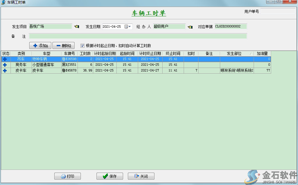點擊新建即可生成車輛工時單,選中發生車輛使用的項目點擊添加對應的車輛,并根據車輛的使用實際情況填報工時信息。