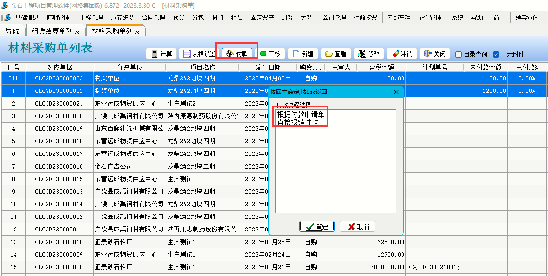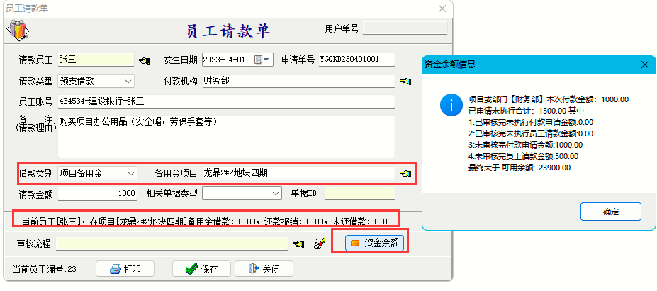 填寫業(yè)務(wù)單據(jù)例如材料采購單,生成付款申請單或者直接報銷付款,選擇沖抵項目備用金,可以查看備用金余額。