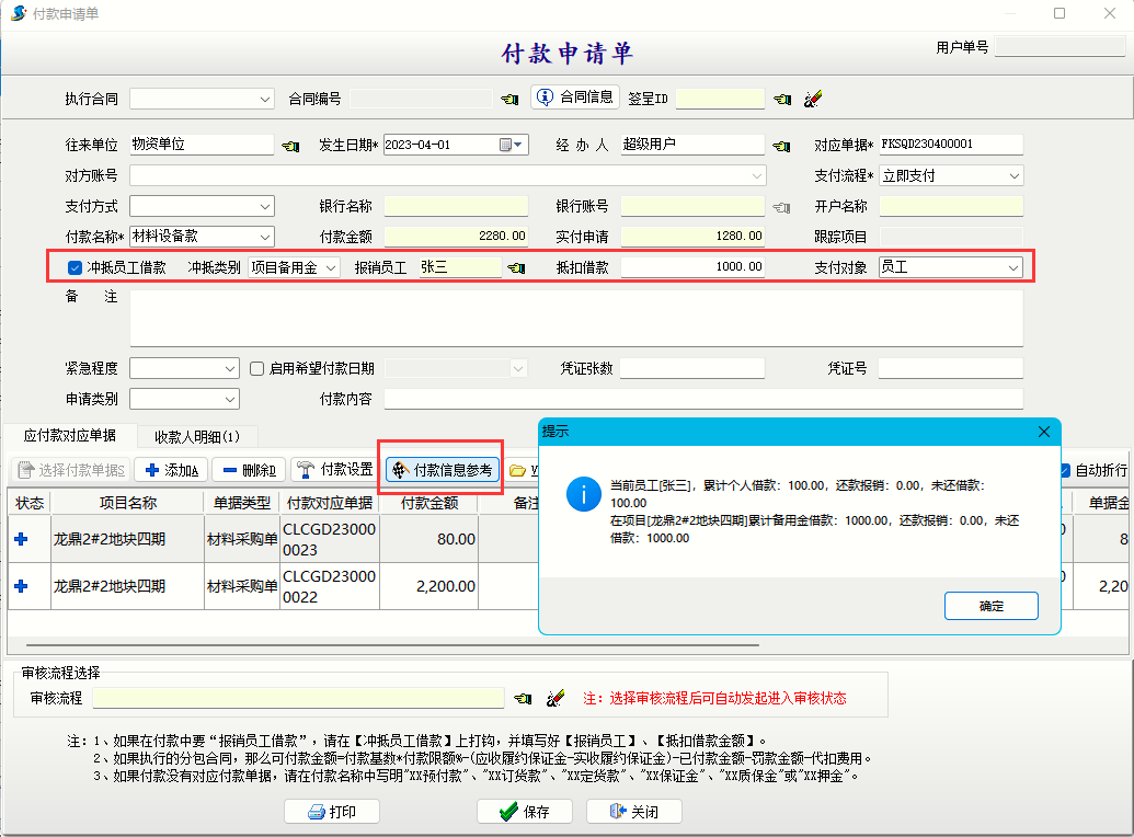 生成付款申請單選擇沖抵員工借款、沖抵類別、報銷員工、抵扣金額、支付對象。點(diǎn)擊付款信息參考可以查看員工借款情況。