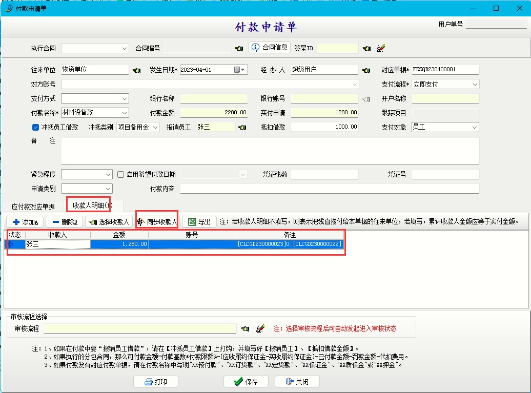 當(dāng)前員工張三備用金借款余額為1000,本次報銷2280,抵扣后還需支付員工1280元。可以在收款人明細(xì)中添加收款信息。