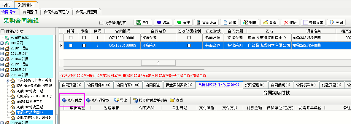 情況1:在合同處點執行付款生成付款申請單,如下圖: