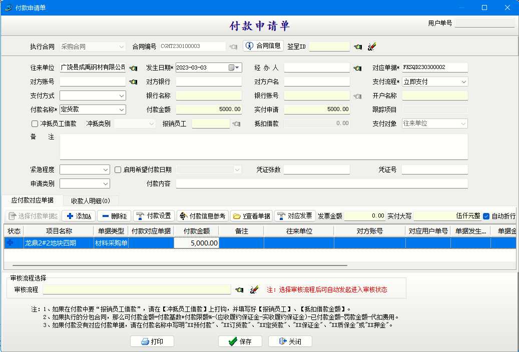和流程3.1.1不同,在錄入發生業務單據時,走的審核流程主要是驗收人參與審核和財務無關,事后在要結算或付款時再做【付款申請單】,在付款申請單中財務參與審核。