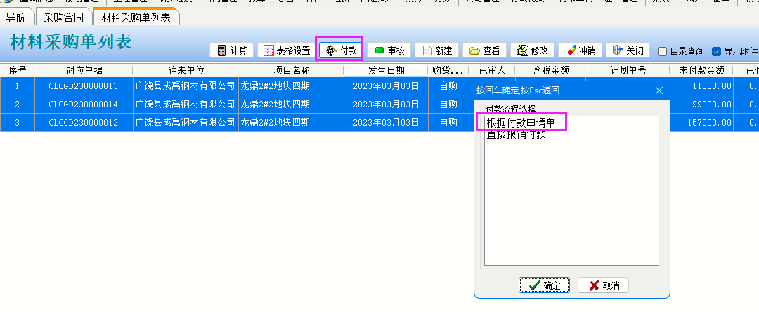 在合同里點擊執行付款或者單據列表里點擊付款,自動根據合同或者單據生成付款申請單。如果合同中有驗收完成的單據生成的付款申請單也能自動對應好驗收完成的業務單據。