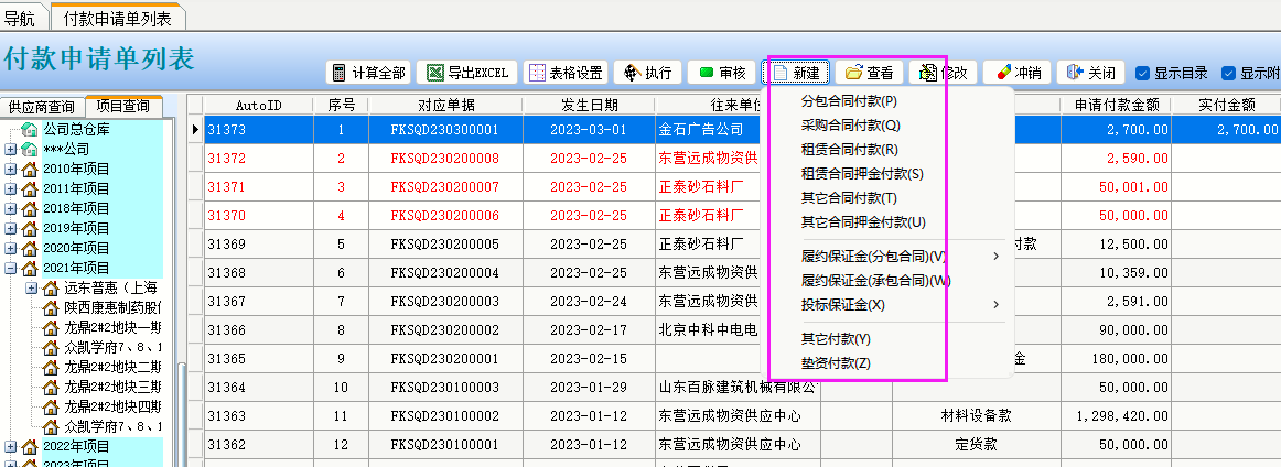 點擊其它付款時,可以選擇不同的項目、不用的單據類型、不同的往來單位生成一張付款申請單。(不是執行合同的業務單據)