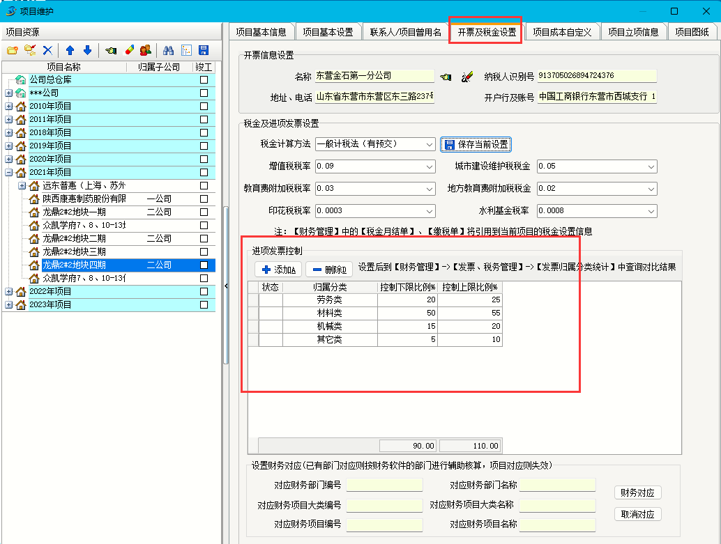 在項目維護中的項目稅金設置中,可以對當前項目的稅金及進項發票進行設置,因為在財務管理的稅金月結單、繳稅單將能引用到此稅金設置。進行發票的控制比例設置,可以幫助企業在項目即將竣工時,能夠一定程度上控制各類發票的比例在一個合理范圍內,從而避免稅務和審計方面的問題。如下圖所示