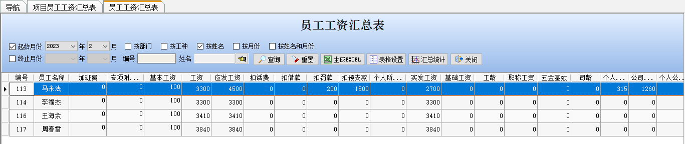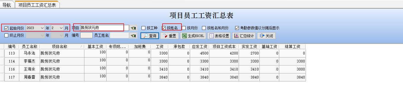 (2)項目員工工資匯總表。此表可根據月份、項目、工種和姓名等字段進行多功能查詢,如下圖所示: