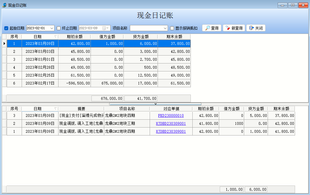 系統中創建完成的收款單和付款單、員工工資單、員工借款單、還款單等單據支付方式選擇現金的都可以自動生成現金日記賬。現金日記賬可以篩選時間和項目,統計每一天以及每一天中每一筆期初余額、借方金額、貸方金額、期末余額。