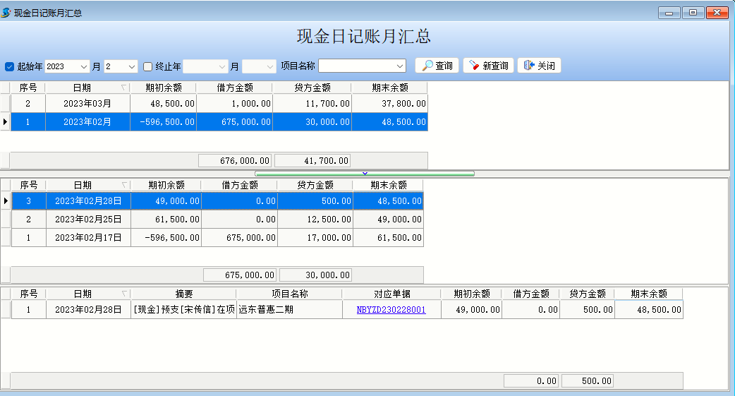 現金日記賬(月匯總)可以篩選時間和項目,統計每一月以及每一天和每一天中每一筆期初余額、借方金額、貸方金額、期末余額。