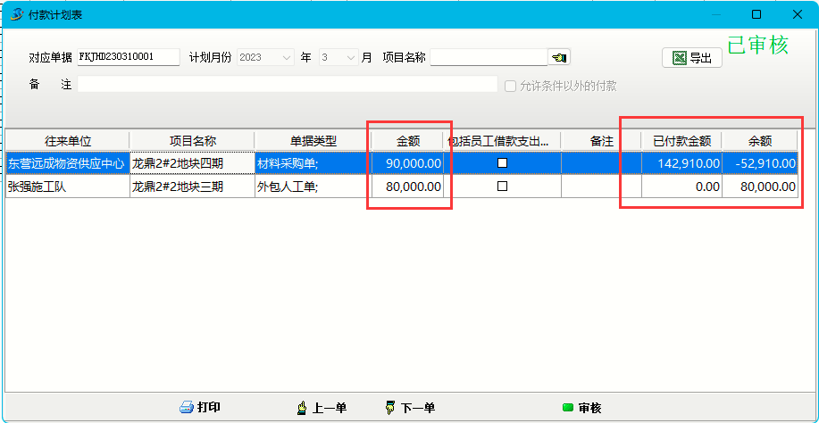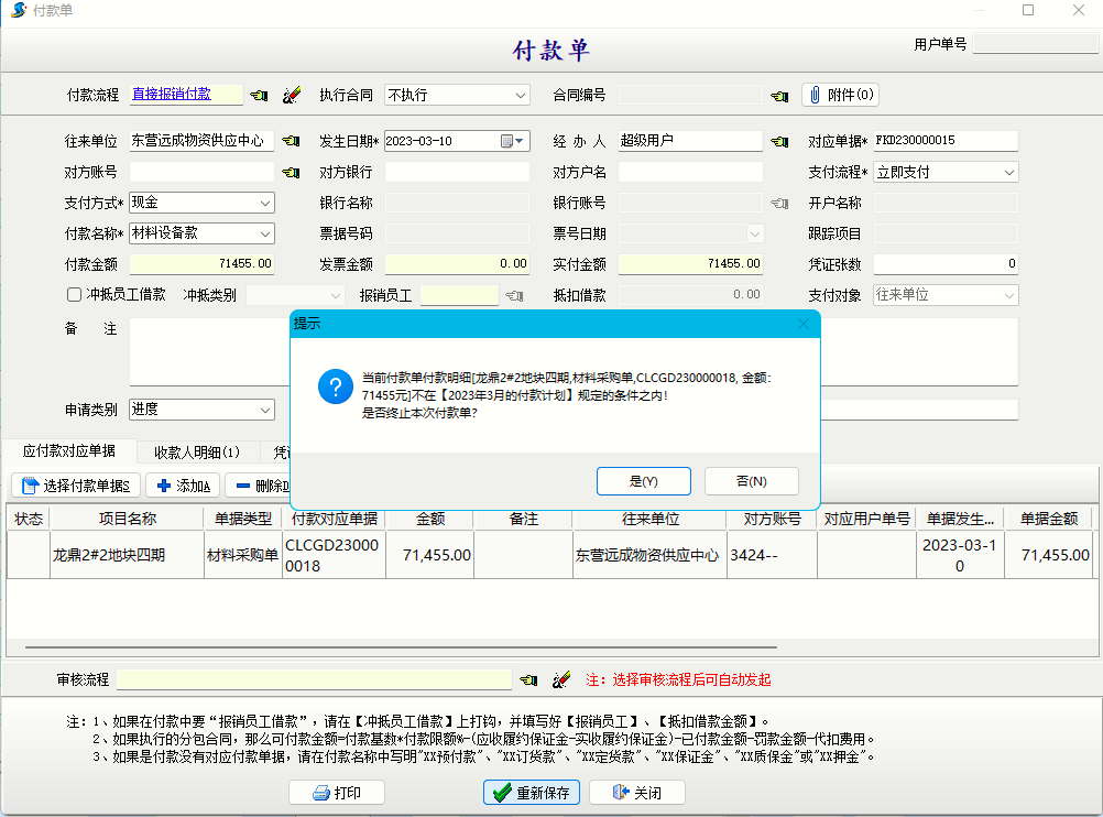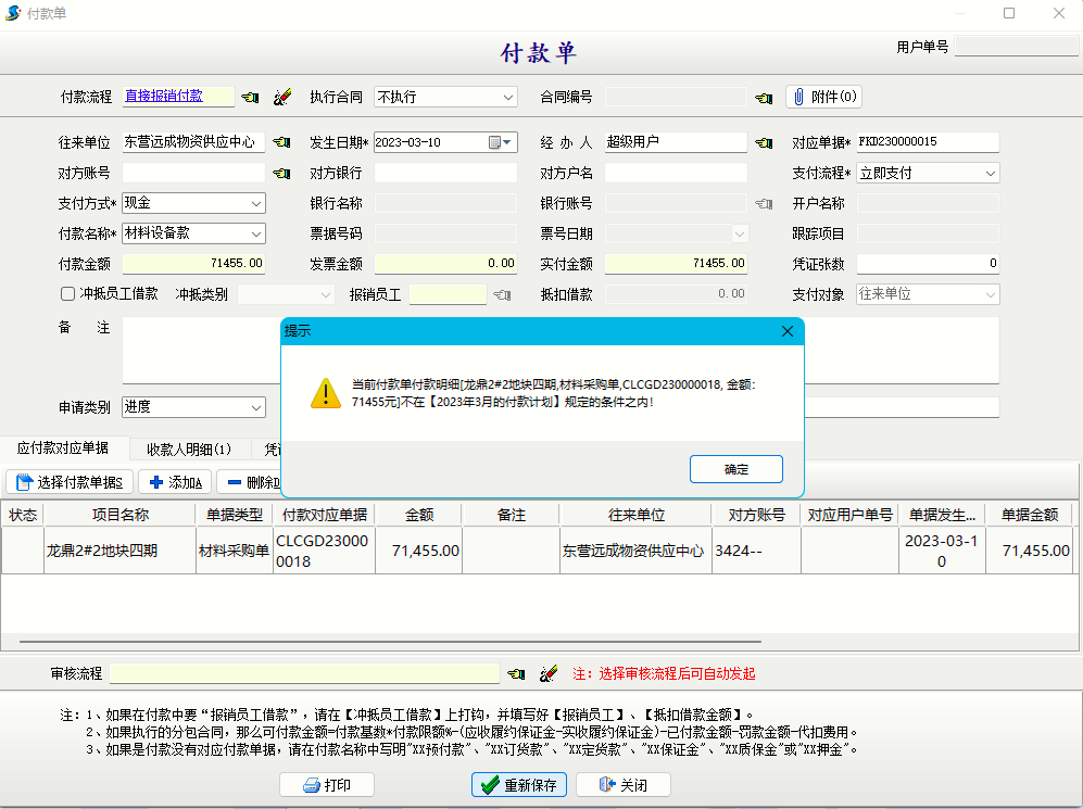 付款計劃保存審核后,在填寫付款單時如果超出付款計劃系統會提示。(如需提示需在系統全局設置中勾選“執行付款單當月的已審核的付款計劃”)