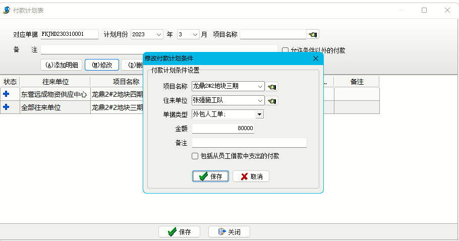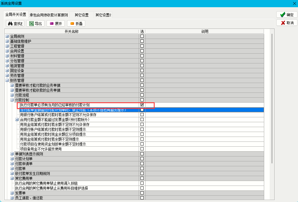 在付款之前業務人員還可以設置每個月的付款計劃,可以按照供應商、項目、業務類型設置付款。還可以設置是否允許條件以外的付款。