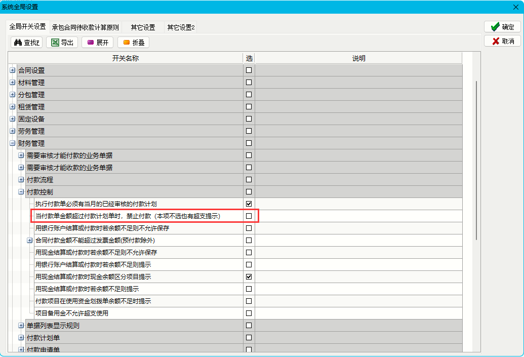 這樣點否還是可以繼續付款。系統還可以限制不能付款,需在系統全局設置中勾選“當付款單金額超過付款計劃單時,禁止付款”
