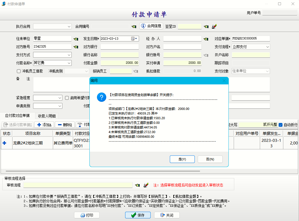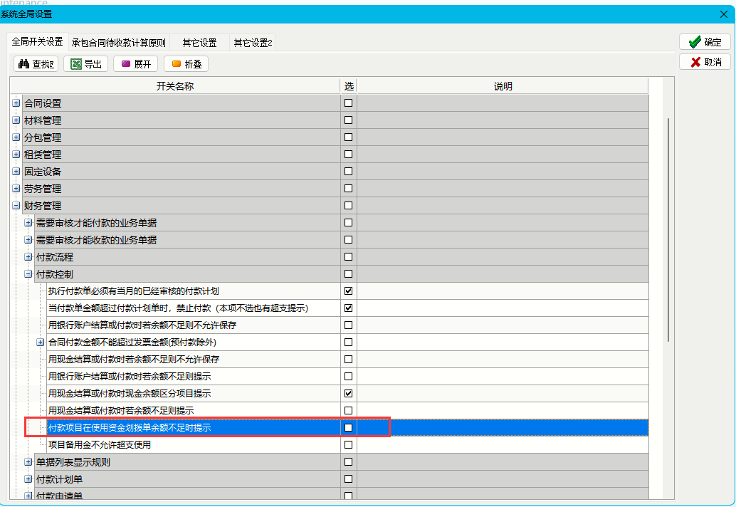 實現按照項目核算資金控制功能必須先在【系統維護】-【系統全局設置】中勾選全局開“付款項目在使用資金劃撥單余額不足時提示”