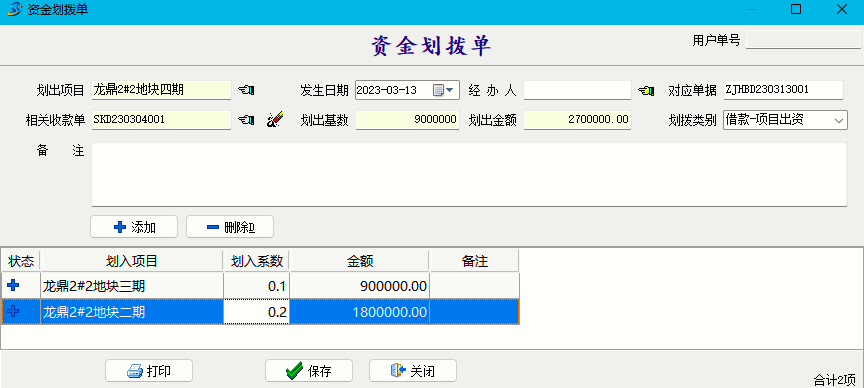【資金劃撥單】可以按照項目劃撥資金,例如A項目有收到工程款,B項目沒有收到工程款,B項目需要支付材料費,可以先用A項目借錢。該單據是虛擬意義的資金劃撥,對銀行現金余額沒有任何影響。只用于按照項目核算資金使用。