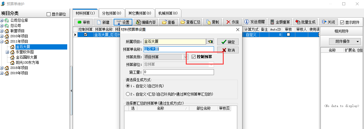 創建好材料預算單以后,假如想對后面票據具有操縱功效,可以設置成操縱預算