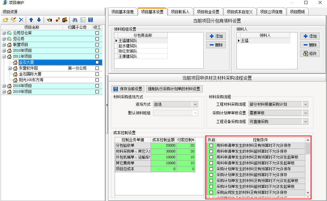 在【工程項目管理】控制模塊?【新項目維護保養】新項目基本上設定可以設置采購方案單,材料出入庫單,材料出庫單,材料調撥單申請強制執行材料預算單。如下圖