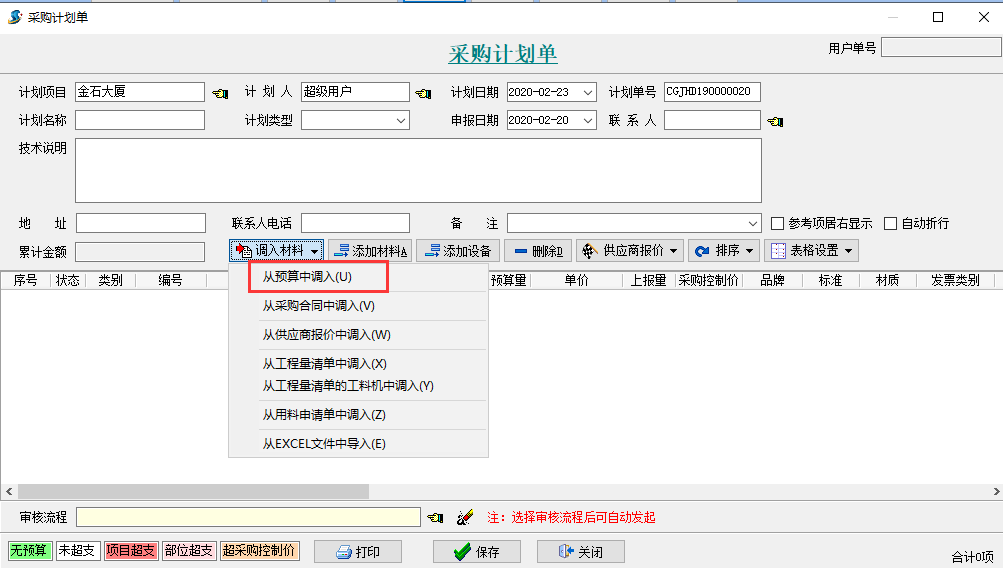 在新創建采購方案單時,加上材料內容挑選從預算中加入,如下圖