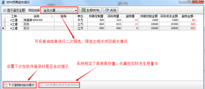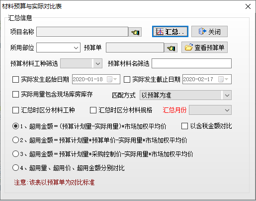 根據預算可以完成預算與具體比照,材料超支提醒,材料盈余比照。