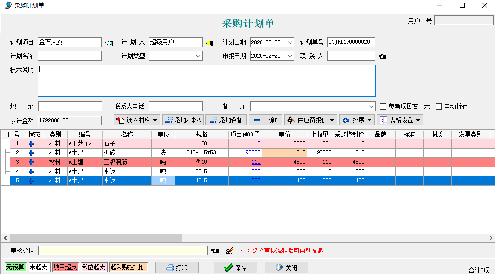 假如超出購置預算單的操縱總數和額度,便會表明不一樣的顏色。如下圖在其中顏色為翠綠色的是沒有預算的材料,乳白色是未超支,鮮紅色是新項目超支,淡粉色是位置超支,棕黃色為超購置控制價。