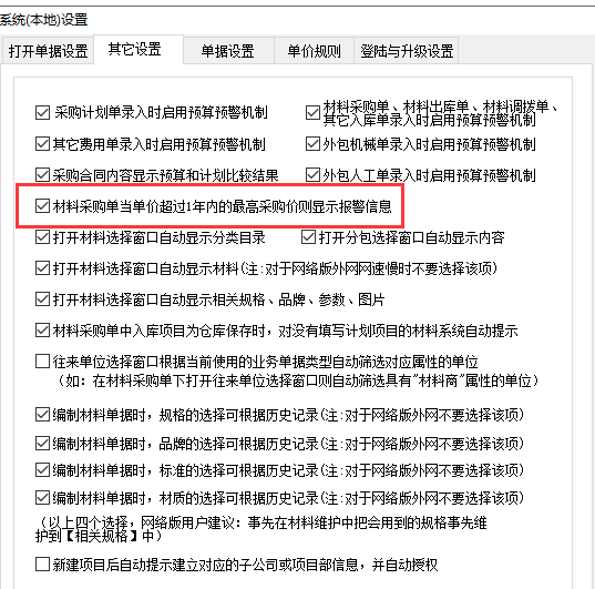 備注名稱:得到該項提醒必須開啟電源開關【服務器維護】-【系統軟件遠程服務器設定】-[別的設定]-在[材料訂貨單當價格超出一年內的最大采購價格則表明警報信息內容]處打上勾。如下圖