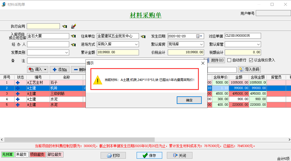 在其中材料訂貨單中也有超出一年內最大采購價格提醒。如下圖