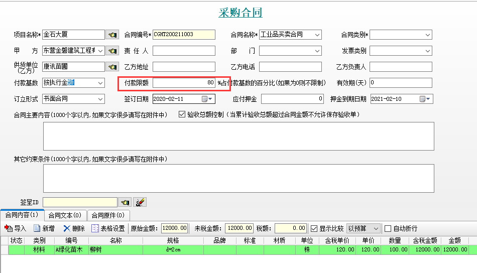 大家創建一個原價為12000的采購協議,支付數量按實行額度,支付額度為80%。如下圖