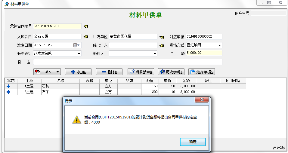 啟用好以后當(dāng)總計(jì)材料甲供單額度超出甲供材料承諾額度時(shí),則不可以?xún)?chǔ)存。如下圖: