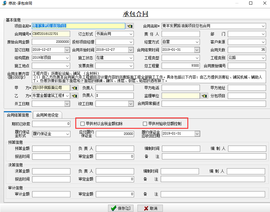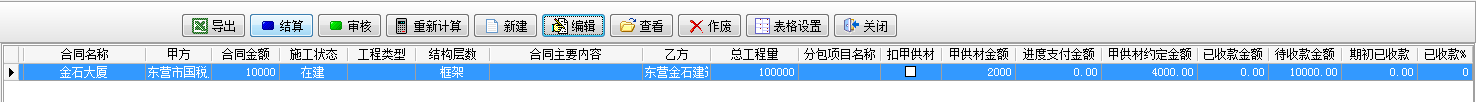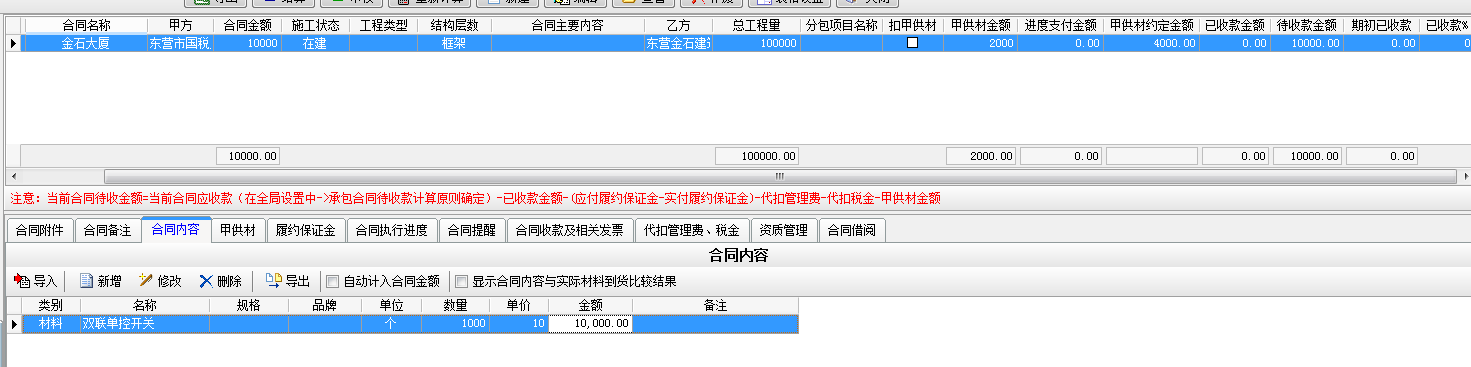 例如大家做一個(gè)合同金額為10000的承包合同,在其中甲供材承諾額度為4000。如下圖