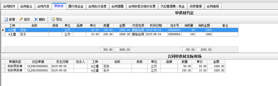 注:絕大多數(shù)【材料甲供單】全是有合同書(shū)根據(jù)的,即挑選承包合同識(shí)別碼,如果不挑選合同編號(hào)很有可能會(huì)直接影響到合同書(shū)待收付款的測(cè)算(當(dāng)今產(chǎn)生新項(xiàng)目相匹配的承包合同中要求的【甲供材扣減工程進(jìn)度款】項(xiàng)打鉤)。