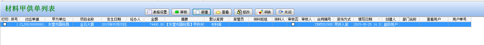 點(diǎn)一下【儲(chǔ)存】回到到【材料甲供單目錄】頁(yè)面下,如下圖: