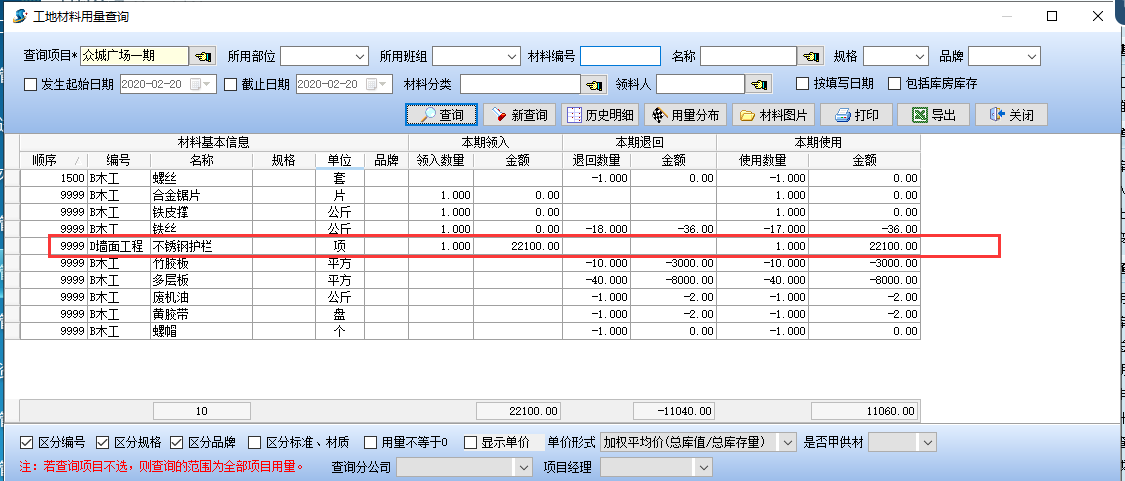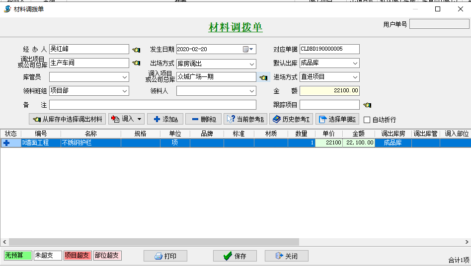“材料調撥單”加上進行以后材料調拔到項目上,則可在材料使用量查看及其項目成本費中查看到相匹配的成本費(如果是調拔到項目庫房則可在庫房中查出相匹配庫存量)。