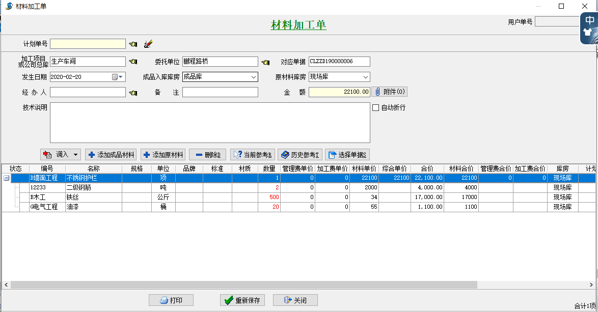 注:(1)在材料加工單的材料目錄中相匹配好各材料所屬的庫房。不然系統軟件會默認設置為默認的“制成品進庫庫房”或“原材料庫房”。
