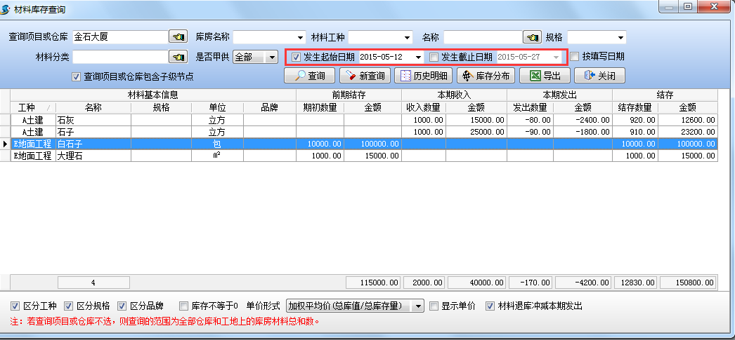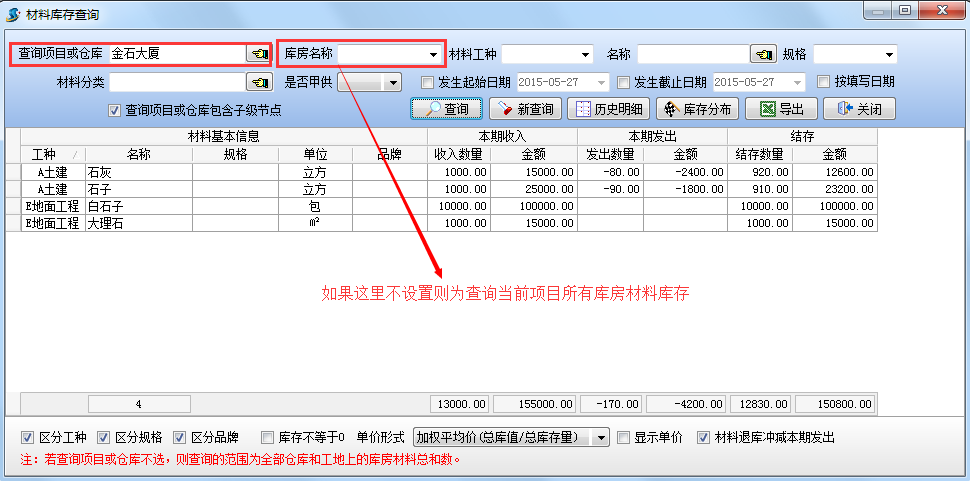 設(shè)定查詢新項(xiàng)目為【金石大廈】,查詢結(jié)果如下圖:查詢當(dāng)今新項(xiàng)目【金石大廈】(包含全部倉庫)的原材料庫存狀況。