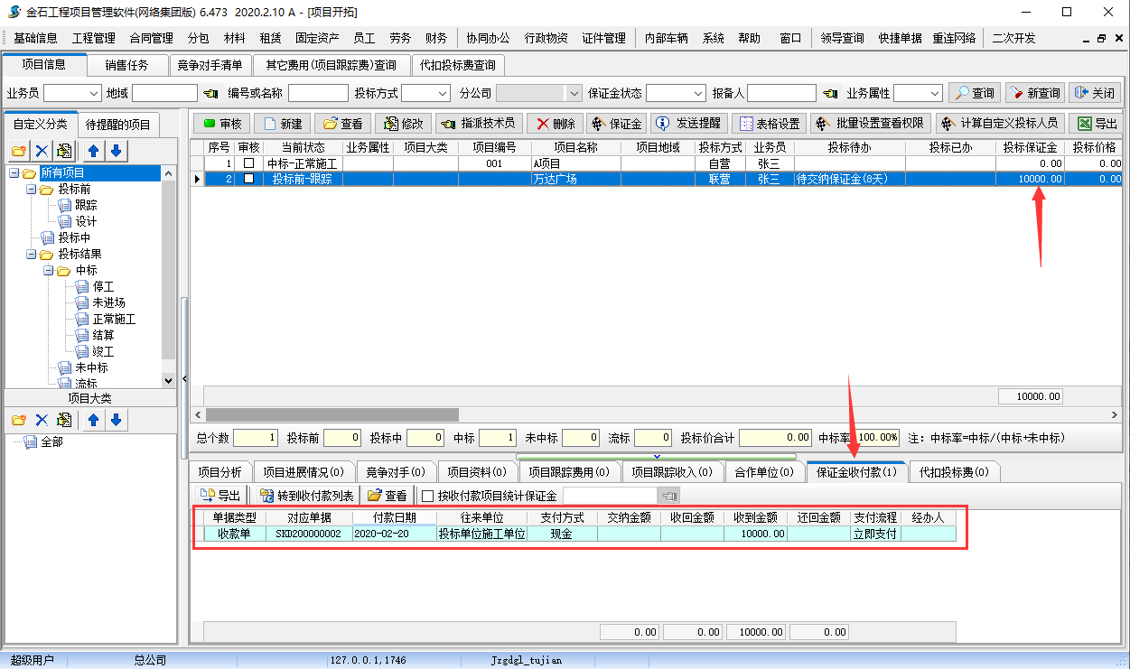 收款完成,系統中會顯示已收到金額以及投標保證金的收付款記錄。如圖所示: