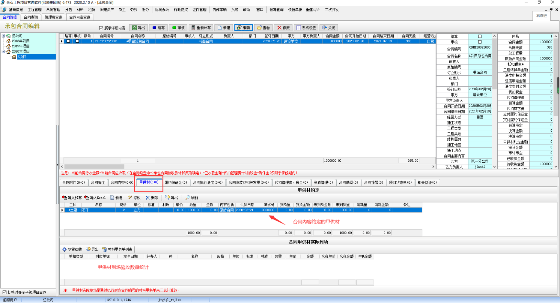 “甲供材料扣減工程款”就是指當雙方明確:一些原材料(如大材)由甲方供貨、工程款中涉及了甲方提供承包方的原材料總金額。清算時甲方再扣減提供承包方總原材料款。當建筑企業和甲方簽署的合同書中有這種條文時,一般都是會明確2個清單項:1、必須甲方供貨XX原材料、及材料清算價格,2、合同書款中包含甲供材金額(甲供材金額=清算價格*在場總數)。假如客戶簽署的合同書歸屬于該狀況則在復選框內打鉤。假如雙方承諾“甲供材工程驗收總金額受操縱”則當總計甲供單金額超出承諾金額時將不允許儲存,需要在復選框內打鉤。在合同書下邊點一下“甲供材”,點擊“增加”的圖標加上甲供材料的主要內容,生產加工原材料在場以后加上“原材料甲供單”(留意相匹配好合同編號)會反映在甲供材在場內容中,如下圖: