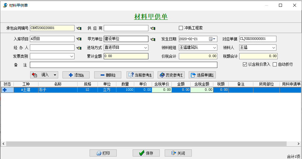 【材料甲供單】這張單據(jù),是在甲供材料進場時填寫的業(yè)務(wù)流程單據(jù),填寫單據(jù)時,入場方法挑選直進項目,則該批材料會直接進入項目甲供成本。