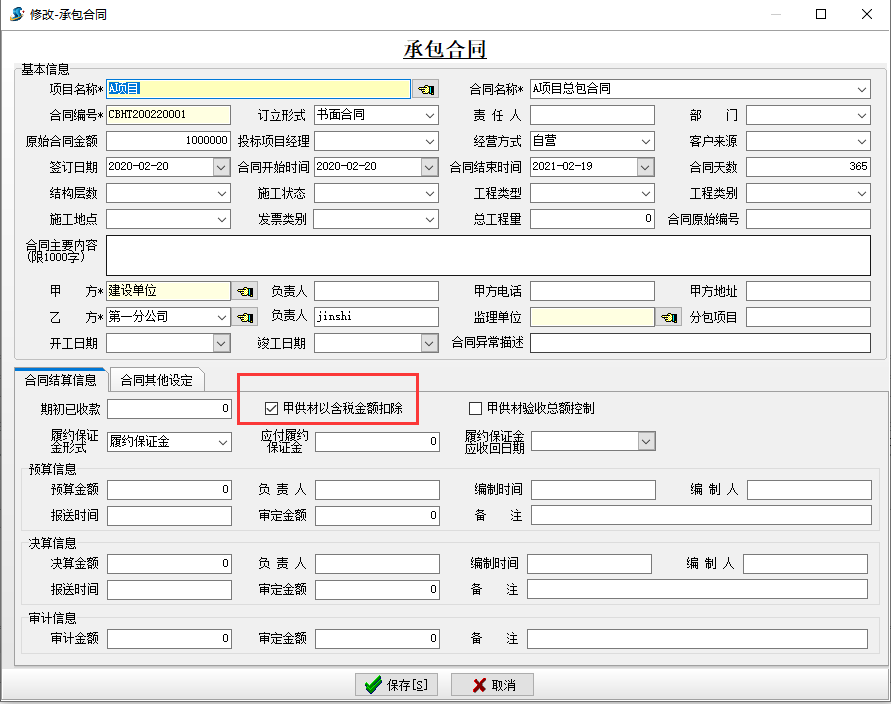 甲供材料甲供材料,是項目常用材料由甲方公司給予。在默認設(shè)置狀況下甲供材不容易統(tǒng)計分析入項目成本,假如客戶期待甲供材統(tǒng)計分析入項目成本,務(wù)必在工程承包合同中把有關(guān)電源開關(guān)開啟,如下圖: